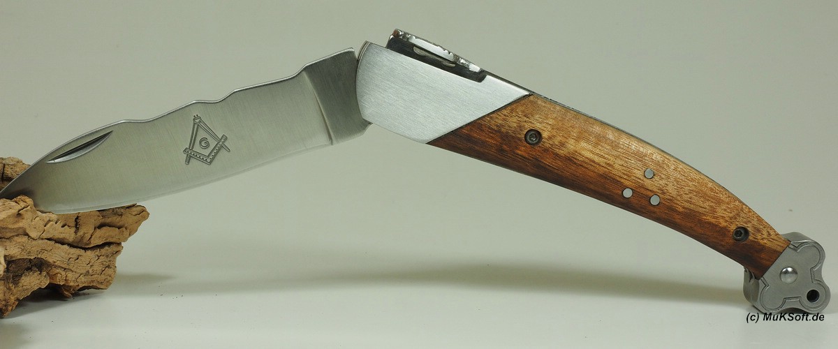 Klinge: Länge 8 cm, Stärke: 3 mm, Stahlfeder, vollständig guillochiert / geschnitten