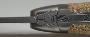 Klinge: T 12, geschmiedet, rostfrei, matt satiniert, Rockwellhärte: 57-58
